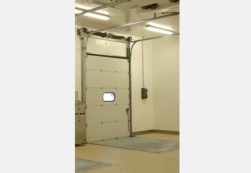 Portone sezionale coibentato, scorrevole in verticale, completo di guida di scorrimento, gruppo molle di controbilanciamento, automatismi paracadute e oblò. I portoni sezionali si aprono verticalmente, risparmiando quindi spazio davanti e dietro il portone.