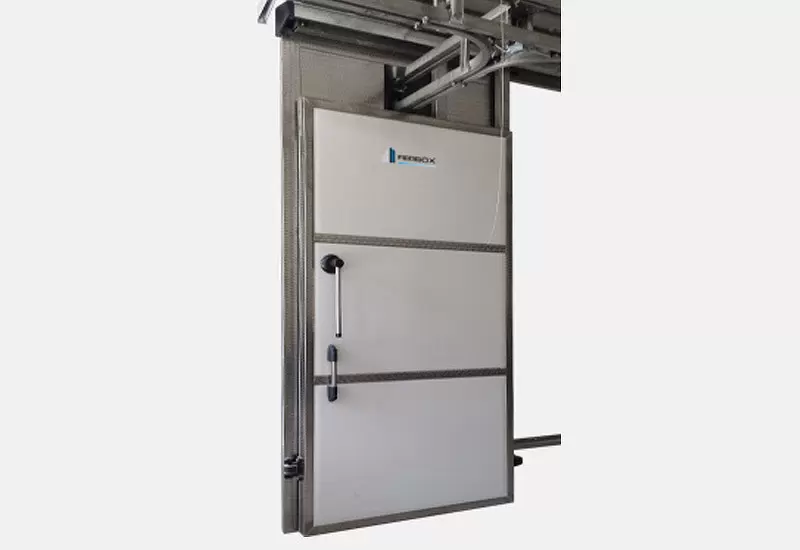 La versione standard viene realizzata con anta in poliuretano espanso sp. mm. 92, finitura in lamiera preverniciata bianca, telaio robusto in PVC, bordo battente e guida superiore di scorrimento in alluminio anodizzato, maniglia a leva in PVC con impugnatura a tubolare Inox e feritoia superiore per il passaggio della guidovia.